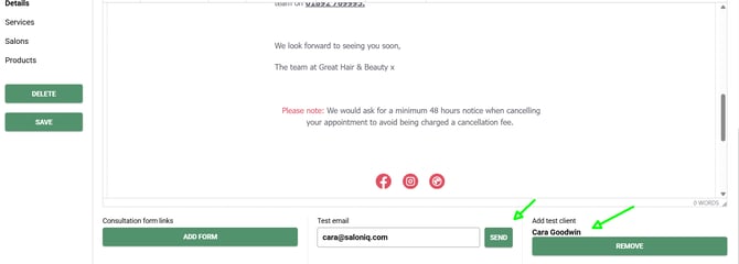 To view all merge fields in your test email, create a booking for yourself before sending the test. This will include all appointment details and consultation forms. Remember to delete your test booking once you’re finished.