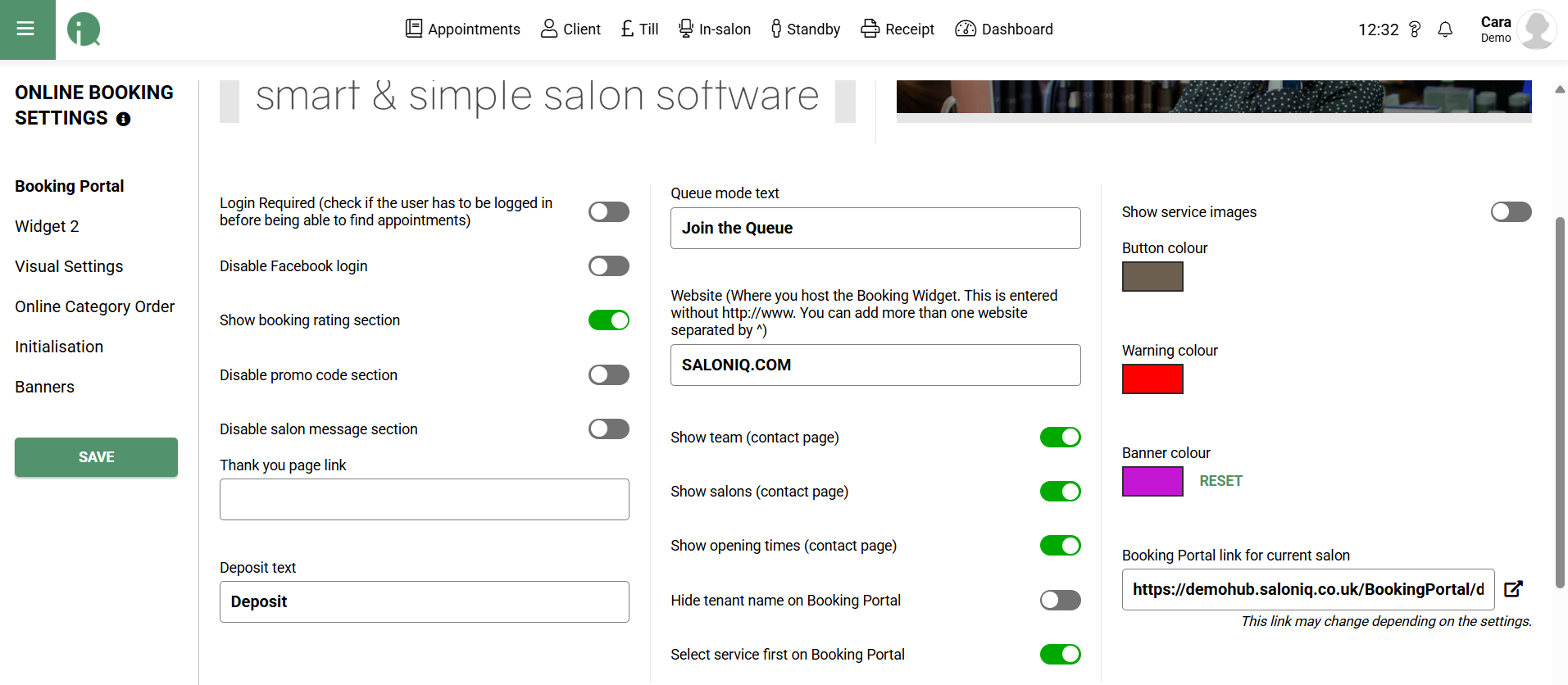 There are many options that you can customise when settings up your online bookings. To make changes to the booking portal and how it appears online Menu > Settings > Online > Booking Portal.