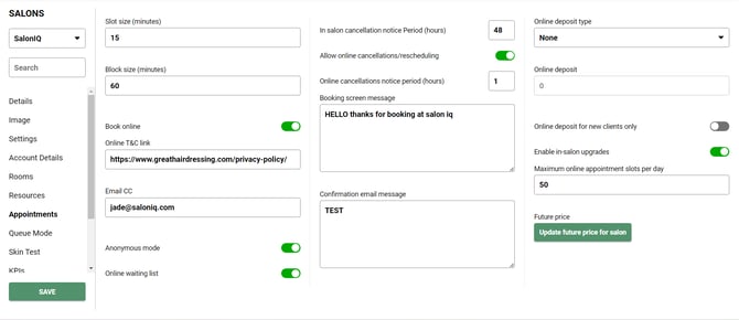 You can decide which services are available at each salon and also if the services are bookable online at each salon