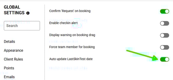 If you have a regular client who comes in frequently and you want their skin test date to auto-update after every appointment, go to Menu > Settings > Global > Bookings and switch the 'Auto Update Skin Tests' toggle to green.