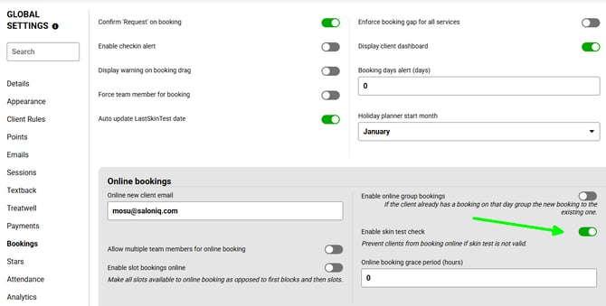 If you would like to prevent any clients booking online without a valid skin test. Go to Menu > Settings > Global > Bookings > togge on green Enable skin test check.
