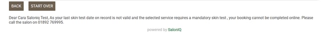 If the clients skin test is not valid, the below message will show to ask the client to contact the salon to make their booking.