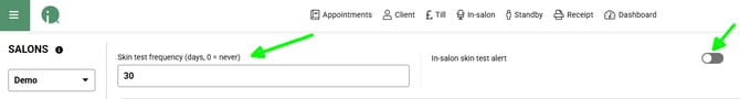 Enter the number of days in which you need to do a skin test. Example, if you require a skin test every 6 months you would enter 180 days. Toggle the In-Salon skin test aleart to green.