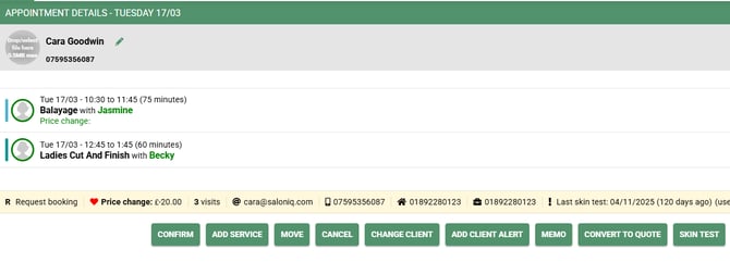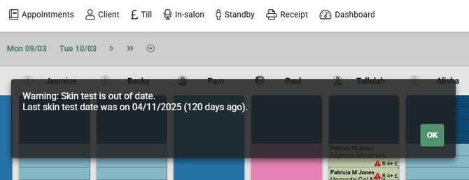 An alert will appear when booking a client’s appointment if they do not have a valid skin test.