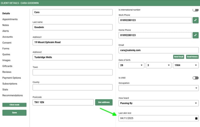 You can also update a client’s skin test from their client record card by going to the **Details** tab and editing the 'Last skin test' field.